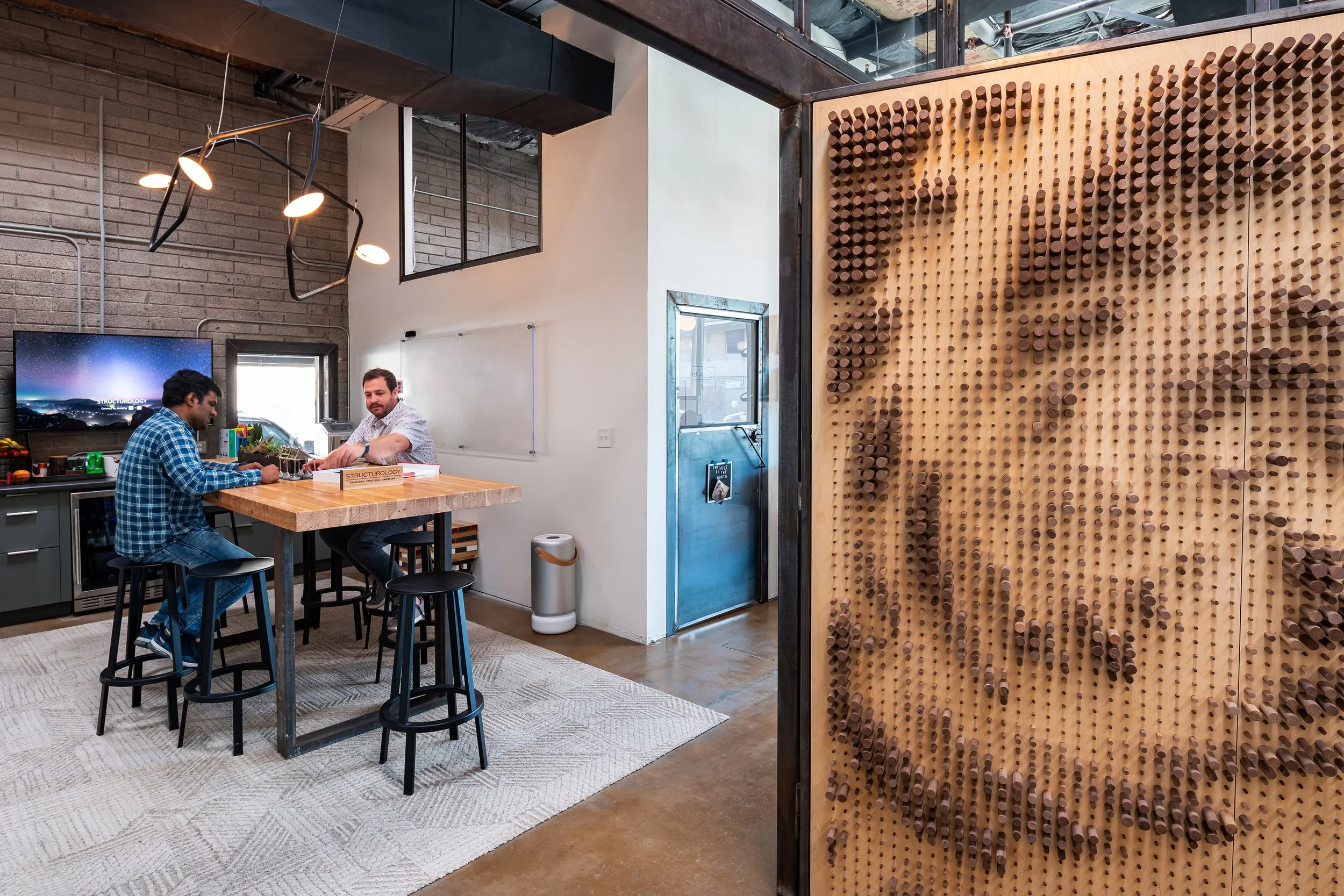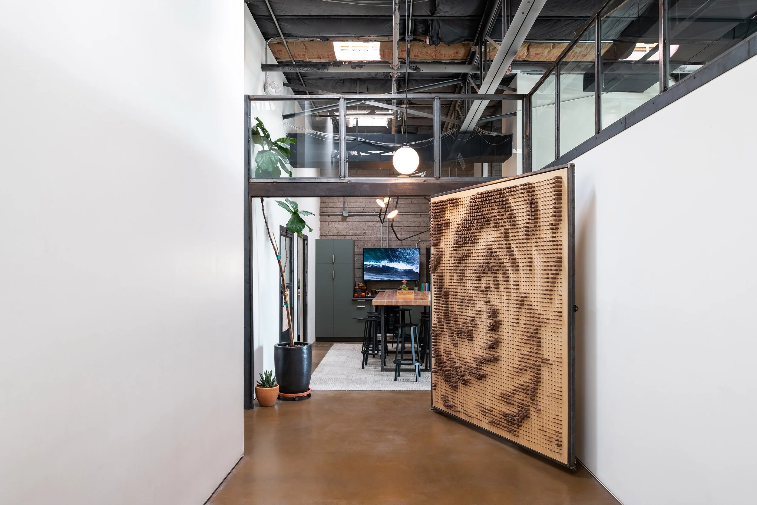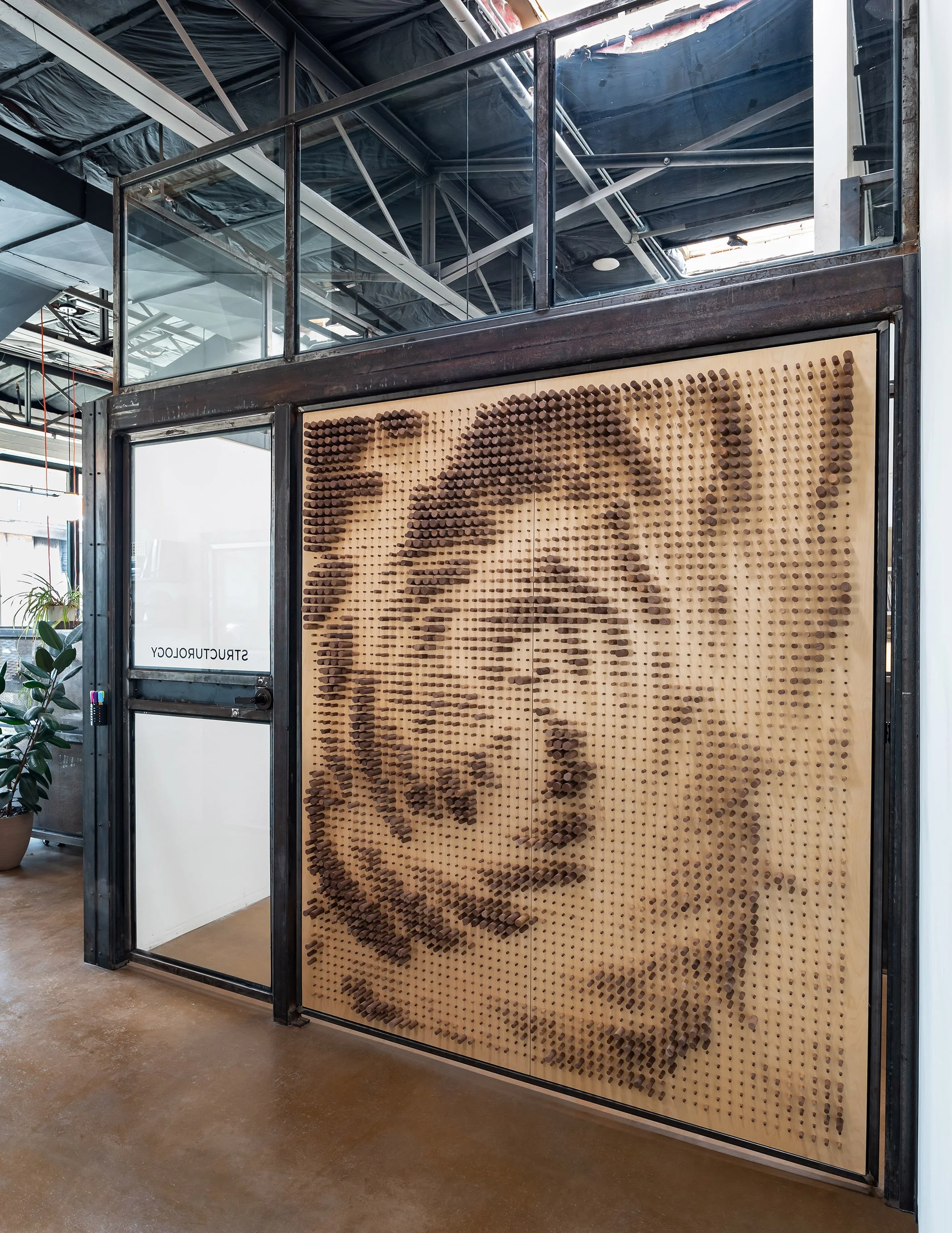 The design of this large custom door is inspired by the geometry of succulent plants. The pin wheel geometry is portrayed through a system of differently sized walnut dowels, both in width and length. Holes that correspond to the dowel diameters were CNC cut into the door substrate and the dowels were hand mounted into the holes.